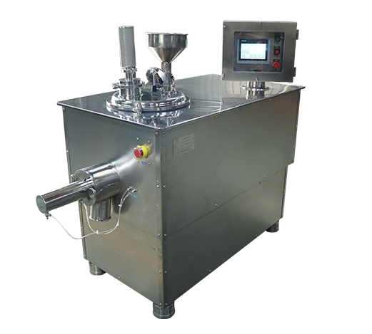本機(jī)用于制藥工業(yè)中的固體制劑生產(chǎn),集傳統(tǒng)制粒工藝中的混合和制粒兩道工序與一體同時(shí)進(jìn)行,其制粒過程是先把粉料投入料筒內(nèi)經(jīng)攪拌漿形成翻滾狀態(tài),使不同性質(zhì)的粉料得到徹底的混合,然后逐量加入粘合劑。(通過攪拌漿和筒壁對物料的擠壓、揉合,使其形成潮濕均勻的軟材,同時(shí)經(jīng)制粒刀片的高速切割,逐步形成大小均勻的顆粒,最后由出料口排出,顆粒目數(shù)的大小由制粒刀的轉(zhuǎn)速和制粒時(shí)間控制)。